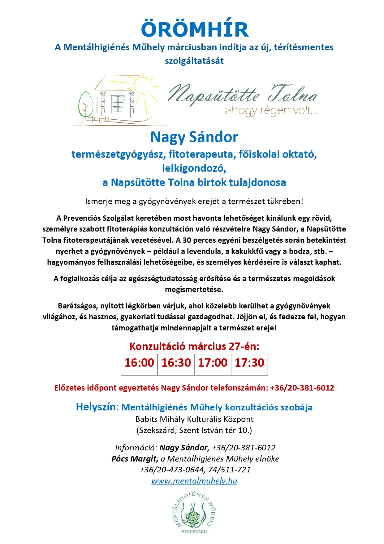 Előadó: NAGY SÁNDOR fitoterapeuta, főiskolai oktató, lelki gondozó